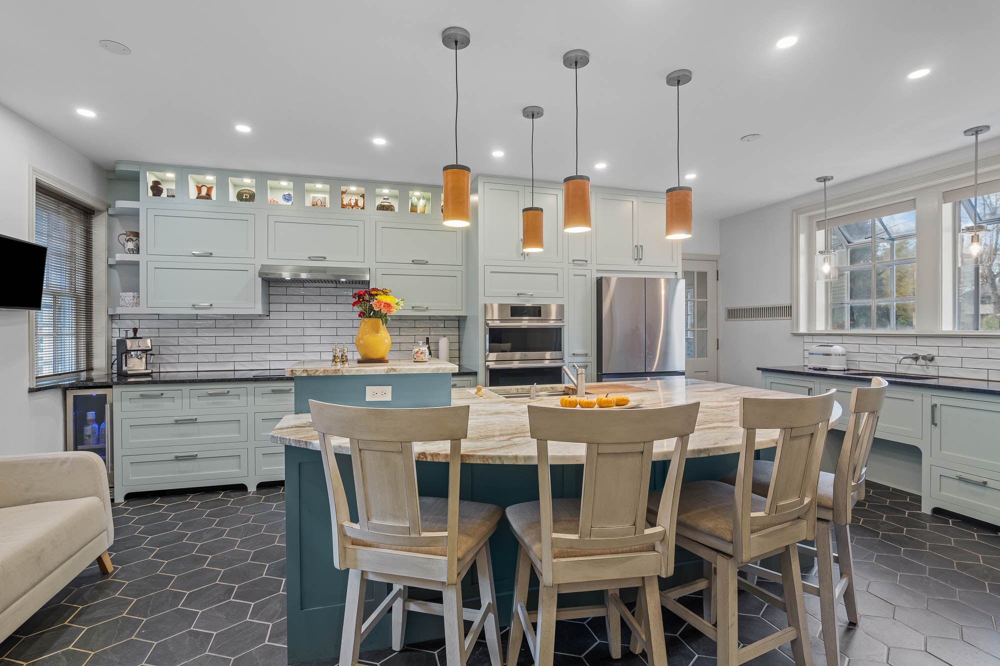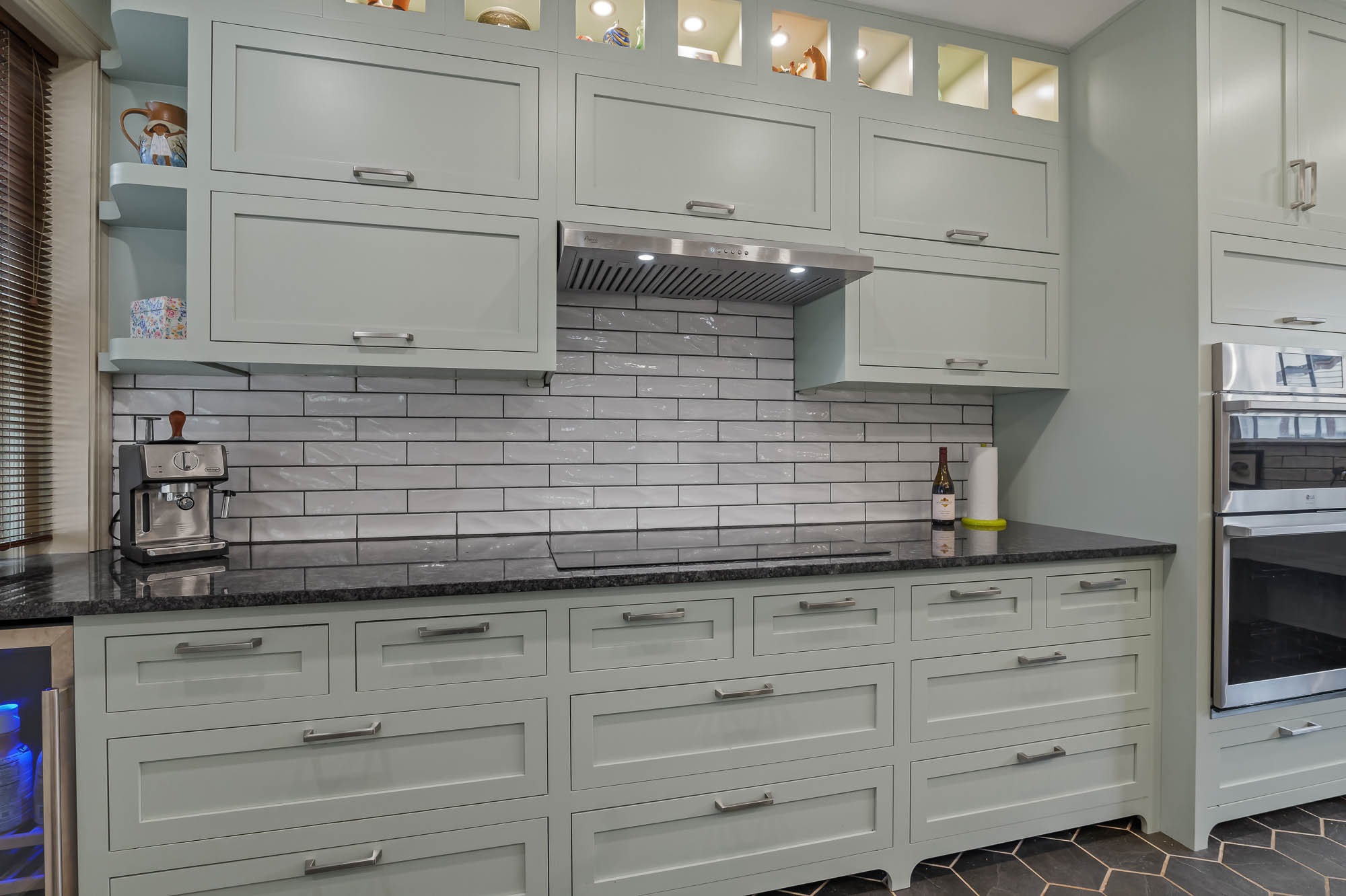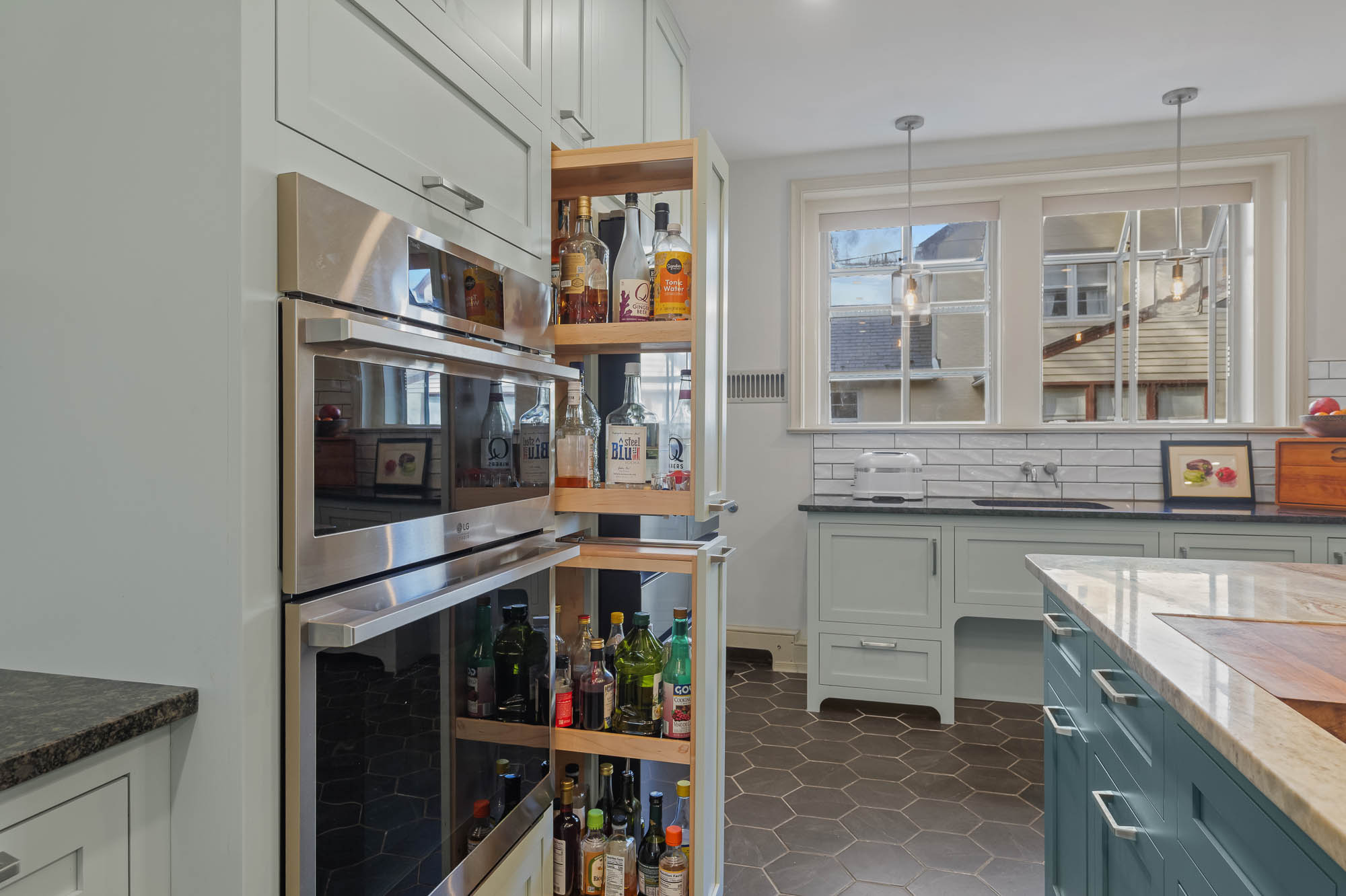 Design details from past and present are thoughtfully woven together, balancing historic charm with purposeful modernity. Honeycomb ceramic flooring, arched valance toe kicks, inset cabinetry, pocket doors, and the preservation of original character elements all honor the home’s origins. In contrast, layered lighting, ergonomic planning, integrated hardware, and updated fixtures support contemporary living.