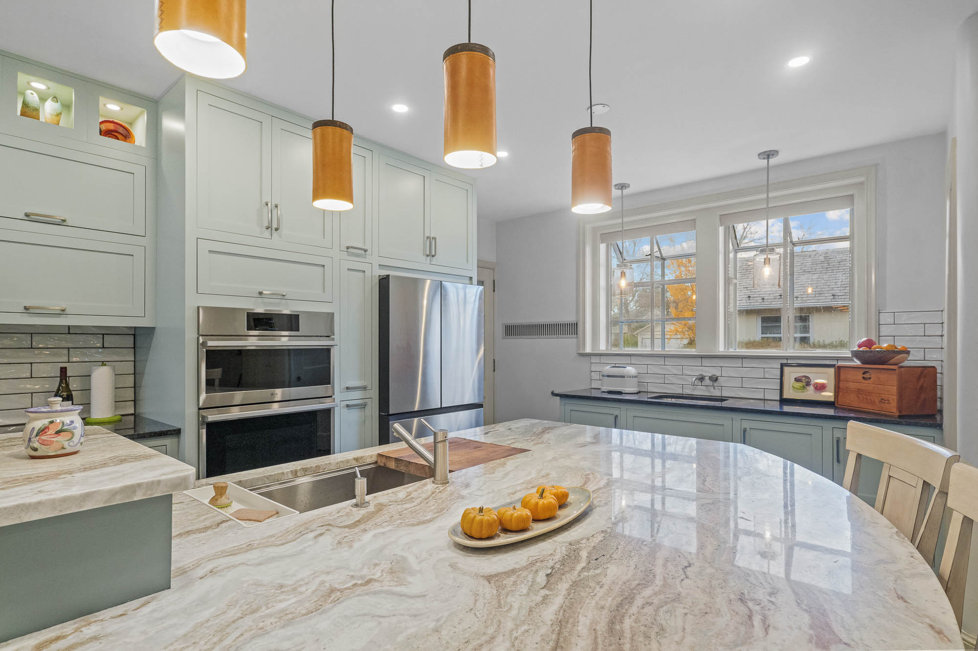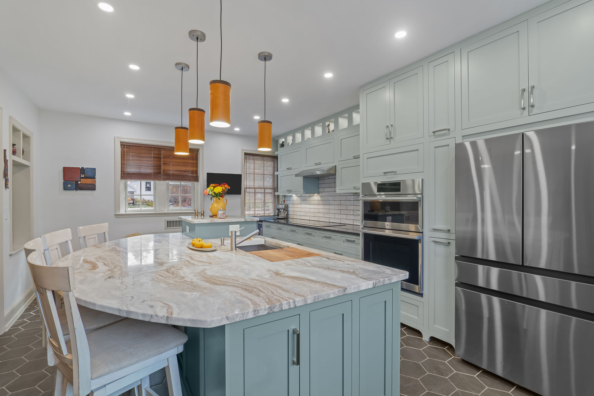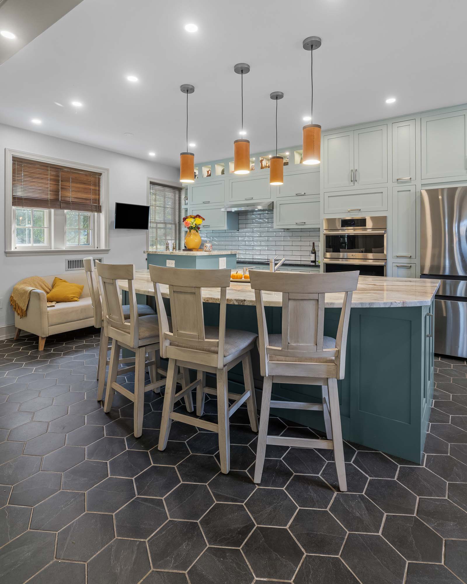Design details from past and present are thoughtfully woven together, balancing historic charm with purposeful modernity. Honeycomb ceramic flooring, arched valance toe kicks, inset cabinetry, pocket doors, and the preservation of original character elements all honor the home’s origins. In contrast, layered lighting, ergonomic planning, integrated hardware, and updated fixtures support contemporary living.