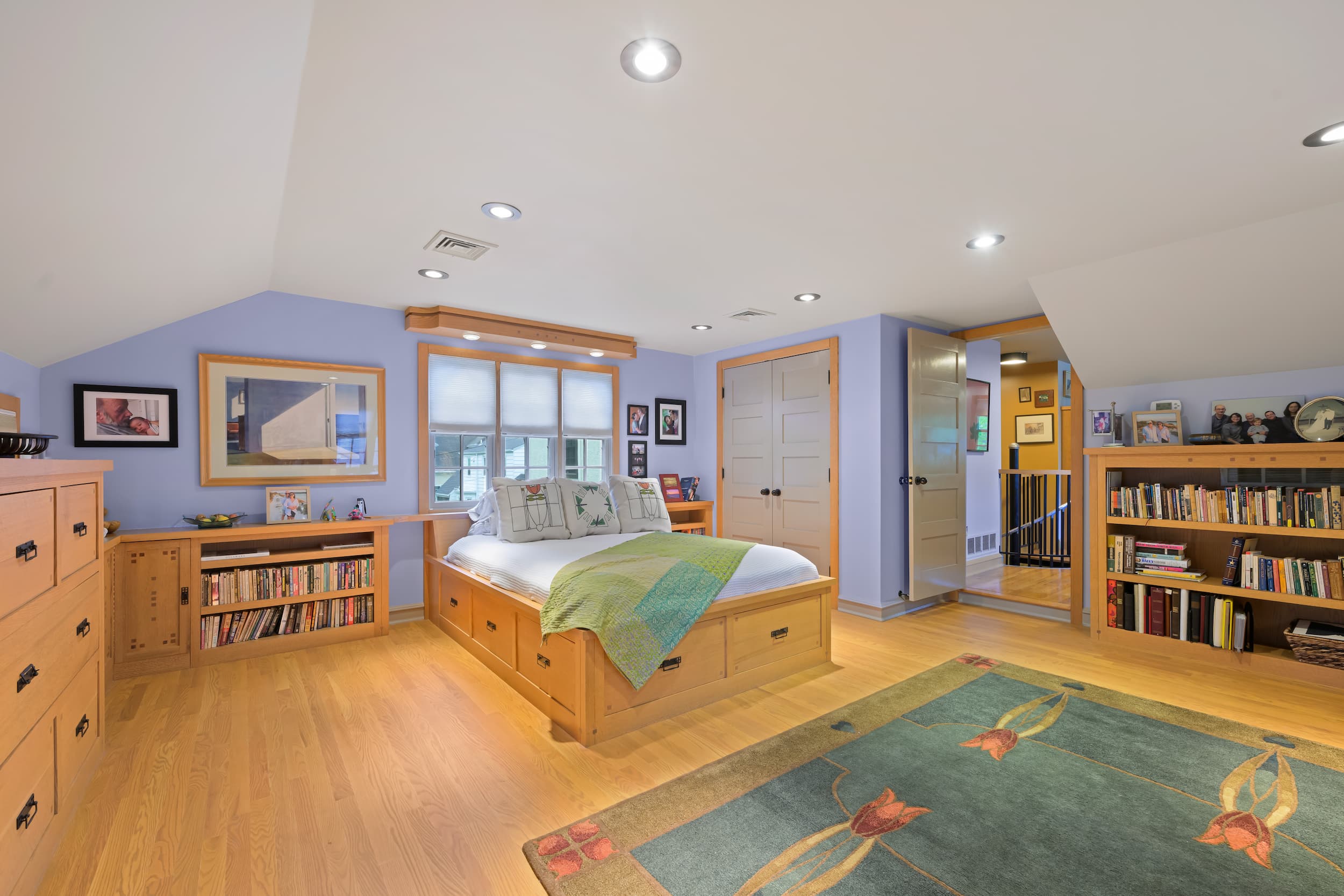 From the outside, the front porch proudly welcomes you with its true dimensional cedar structure, copper roof, step lights, rain chains, and stonework. Looking up, the third-floor attic was expanded by lifting the middle roof and adding two large dormers. This space is now a quiet escape, complete with another custom library, office, daybed, and cedar closet.