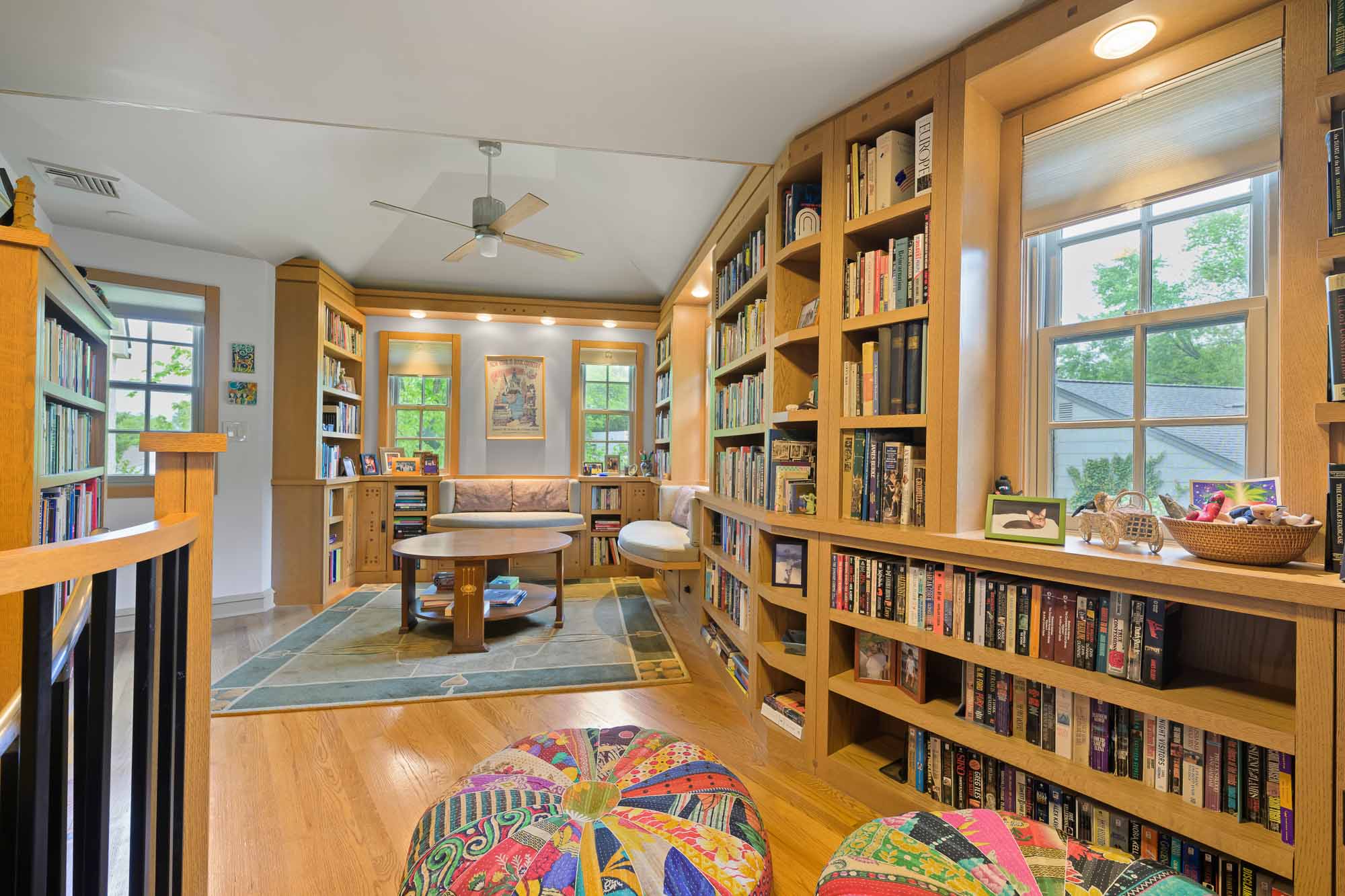 In time, the owner—an author and professor emeritus—recognized the need for housing her expansive book collection, as well as a quiet creative retreat and covered front porch. As a native of Santa Barbara, California, the client has long admired its Craftsman architecture. With this inspiration, the details of the work demonstrate a true craftsmanship of materials. Red oak with varying stain finishes, inlays, and hardware used in the custom built-ins reflect that era of building. The kitchen flaunts a honed black granite café countertop, handmade Motawi tile backsplash, floating shelves, a highboard with velvet-lined drawers, and a lowered cooking station for ease of use.