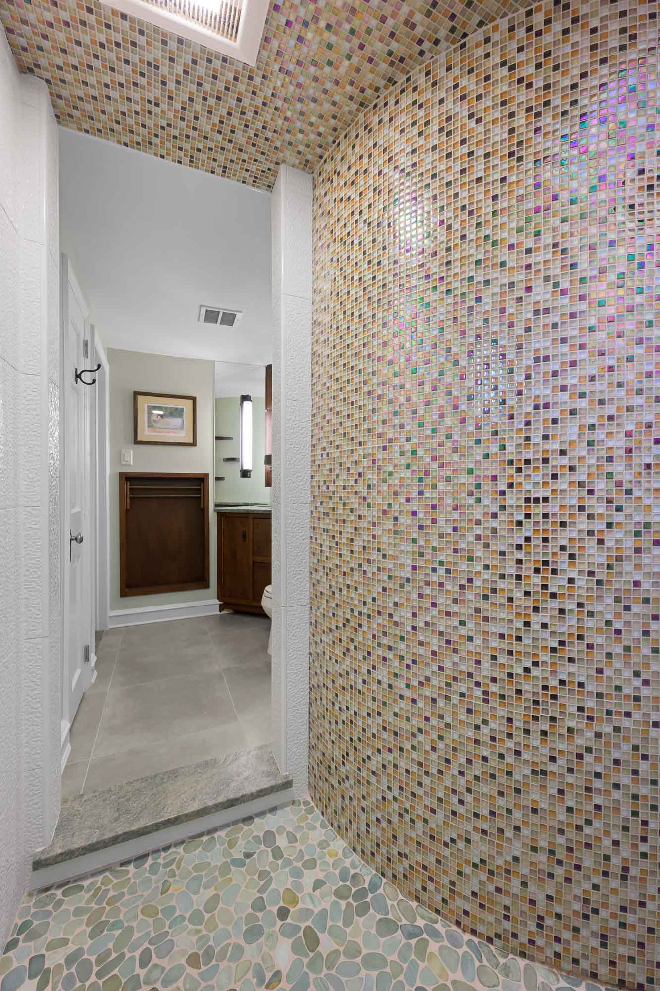 The initial design was a two-story stone and stucco addition. On the first floor, the existing butler’s kitchen was enlarged to create a dynamic, open communal cocina with mudroom, pantry, outdoor access, and direct garage entry. Central to this space is a spiral staircase that leads to the second story, where a pyramid atrium library, prepared for guests, is flooded with natural light from all angles. This room serves as a bridge between the primary suite and guest bedroom, with an office built above the existing garage.
